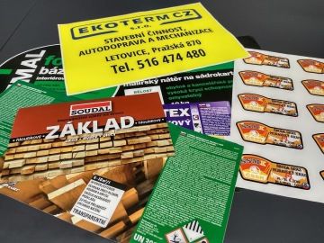 Samolepky na arších vyrábíme nejčastěji z papíru, ale v atypických případech tiskneme i plastové (nejčastěji polypropylenové nebo PVC).